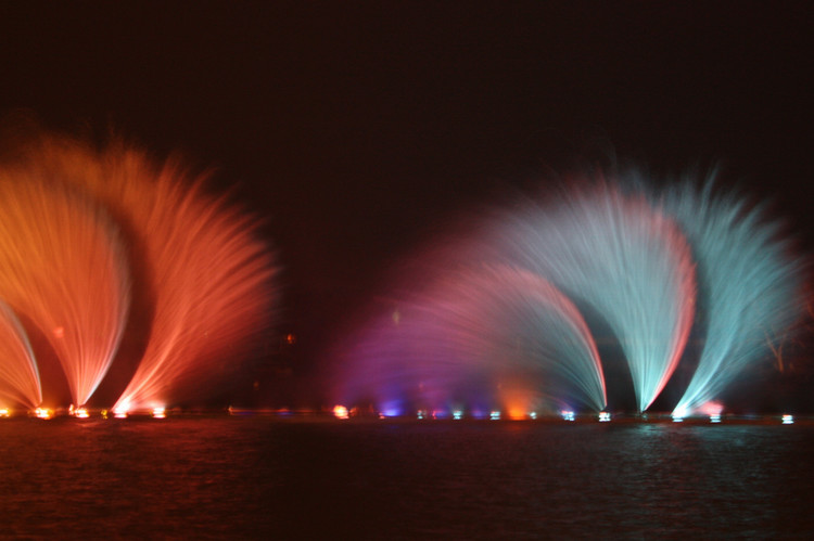 肇慶牌坊廣場音樂噴泉,位于牌坊廣場北面,前面正對七星巖牌坊,后面臨近中心湖,與西江潮娛樂城露天平臺隔水相望。彩色音樂噴泉主體,是噴泉專用水池,池呈圓弧形,外弧長80米,內弧長72米,寬度13米。噴池內,安裝有各種水泵320臺、水下燈1818盞(其中高光燈98盞)、噴嘴5422個,噴泉主噴高74米,副主噴高28米,次主噴高18米;噴池外,正面和左右兩側面,是1.8米寬的凹槽形水池,水面上蓮葉、蓮花飄逸,后面筑一花基,其上種有四時花卉,與彩色音樂噴泉組成一幅色彩繽紛的畫圖。
