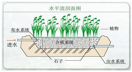 污水從人工濕地的一端進入,在人工濕地床表面下以近水平流方式流動,最后流向出口,使污水得以凈化的人工濕地形式。