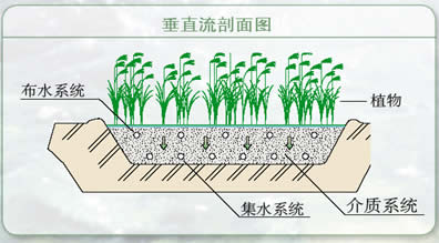 污水從人工濕地表面垂向流過基質(zhì)床的底部或從底部垂直向上流向表面,使污水得以凈化的人工濕地形式。