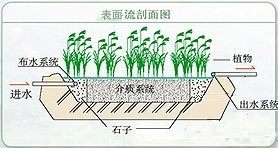污水在人工濕地的土壤等基質(zhì)表層流動,依靠植物根莖與表層土壤的攔截作用以及根莖上生成的生物膜的降解作用,使污水得以凈化的人工濕地形式。